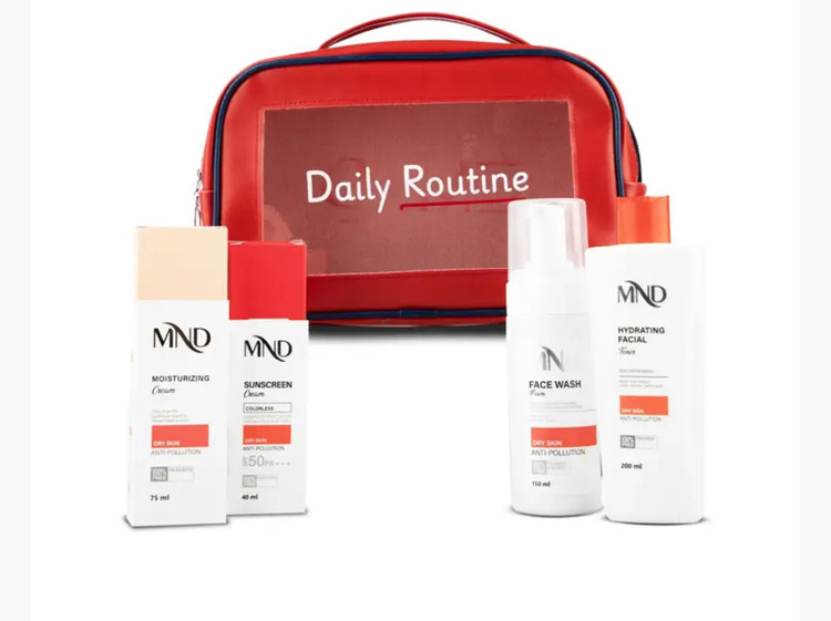 این پک مراقبت روزانه MND مناسب پوستهای خشک بوده و شامل فوم شستشو، تونر صورت آبرسان، کرم مرطوب کننده و کرم ضدآفتاب است.