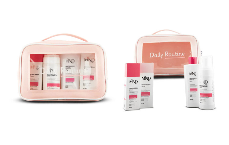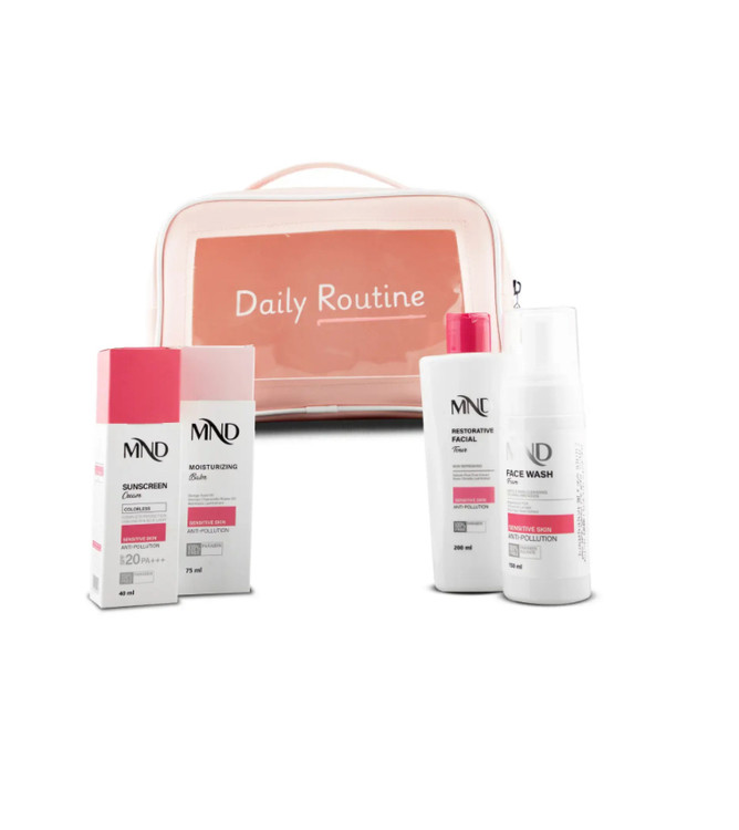 این پک مراقبت روزانه MND مناسب پوستهای حساس بوده و شامل فوم شستشو، تونر صورت تقویت کننده پوست، بالم مرطوب کننده و کرم ضدآفتاب است.